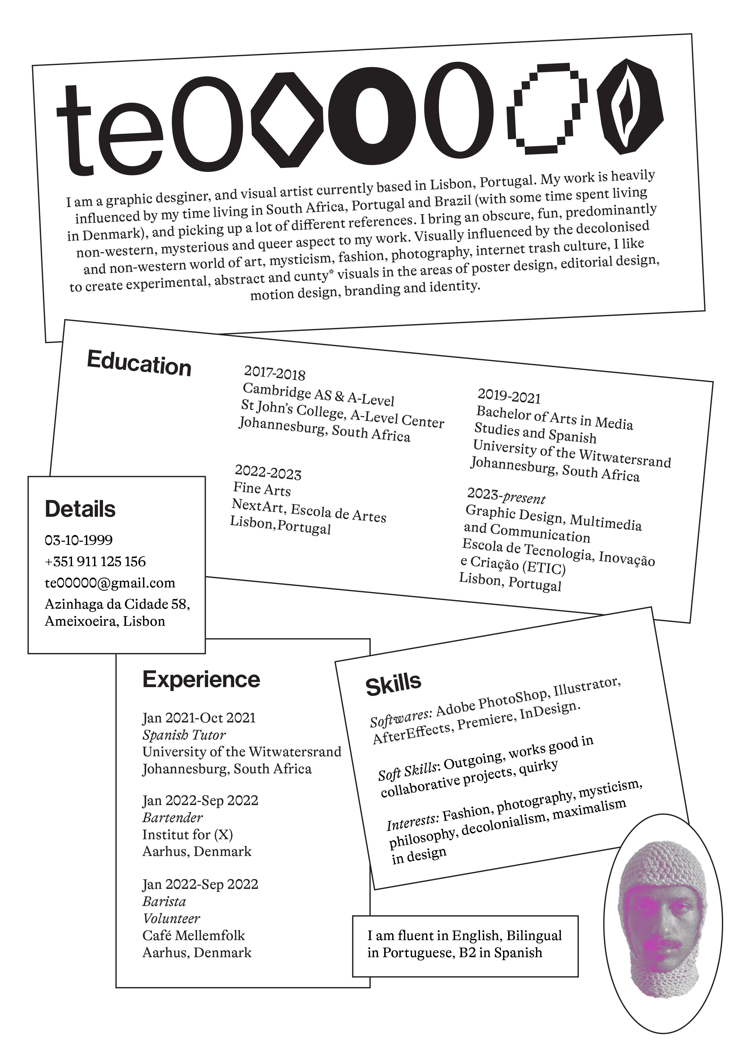 I am a Graphic Designer currently based in Lisbon, Portugal. My work is heavily influenced by my time living in South Africa, Portugal and Brazil (with some time spent living in Denmark), and picking up a lot of different references. I bring an obscure, fun, predominantly non-western, mysterious and queer aspect to my work. Visually influenced by the decolonised and non-western world of art, mysticism, fashion, photography, and internet trash culture; I like to create experimental, abstract, loud and cunty* visuals in the areas of poster design, editorial design, motion design, branding and identity.